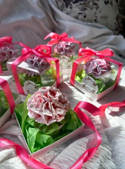 12×12 cm ölçülerinde, 15 adet yenilebilir marshmallow çiçekten oluşan hediye kutusudur.