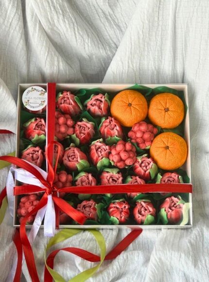 25x30 cm boyutundaki şık kutusunda görsel bir şölen! El yapımı marshmallow çiçek ve 3 adet yenilebilir portakal figürü ile hazırlandı.