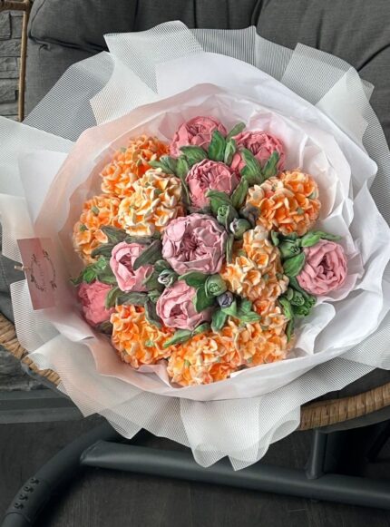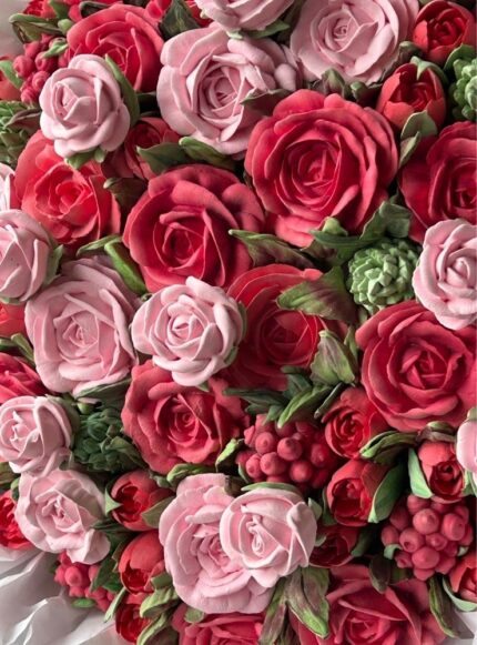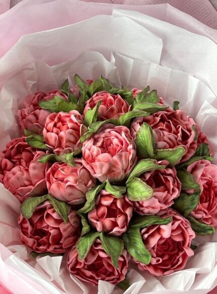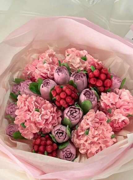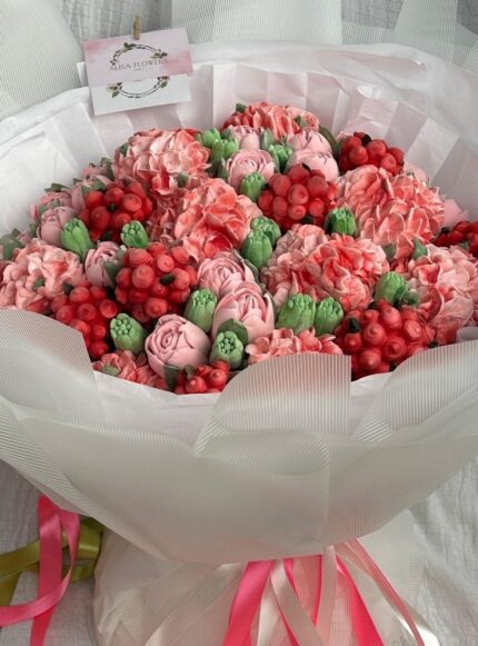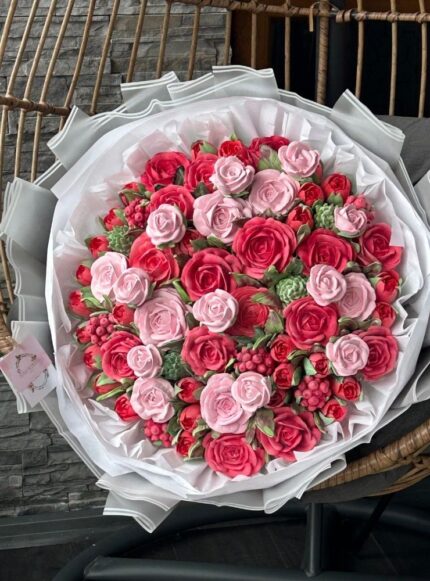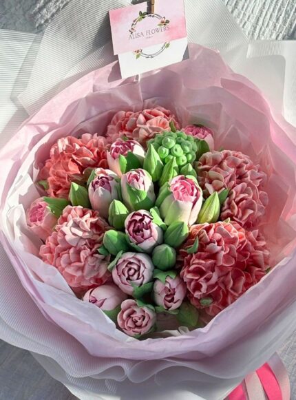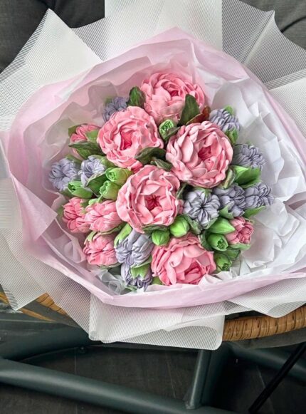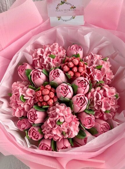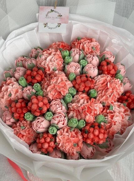 40 cm boyutunda, el yapımı yenilebilir marshmallow çiçeklerden oluşan fantezi bukettir.