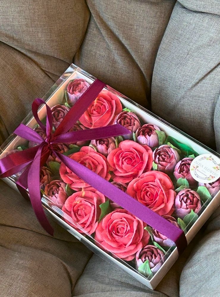 Kutudaki tüm çiçekler tamamen yenilebilir marshmallow malzemesinden üretilmiştir.