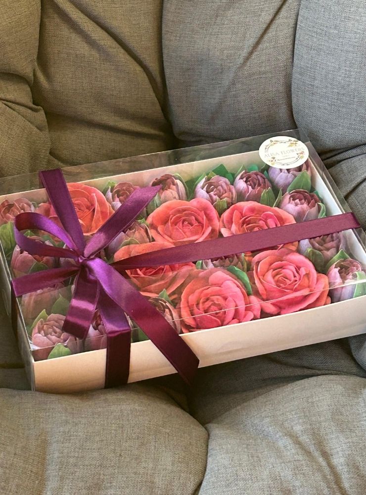 Kutudaki tüm laleler tamamen yenilebilir marshmallow malzemesinden üretilmiştir.