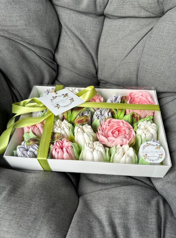 Kutudaki tüm laleler tamamen yenilebilir marshmallow malzemesinden üretilmiştir.