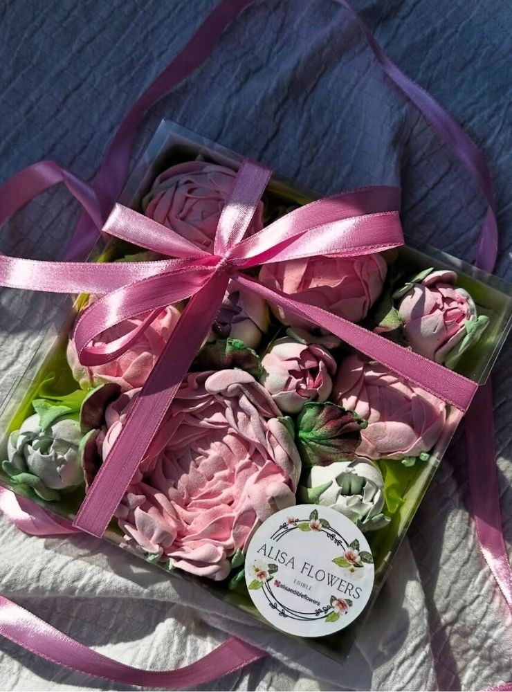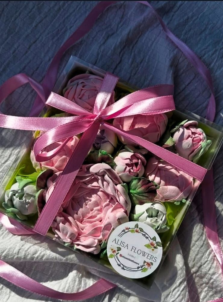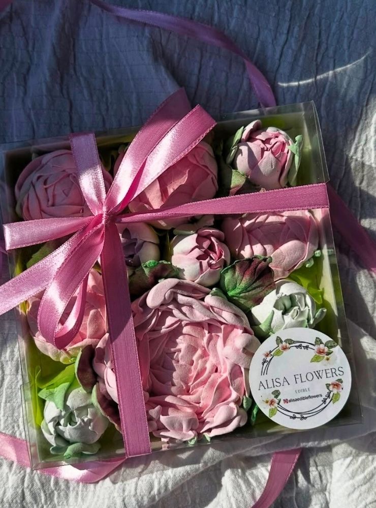 Kutudaki tüm çiçekler tamamen yenilebilir marshmallow malzemesinden üretilmiştir.