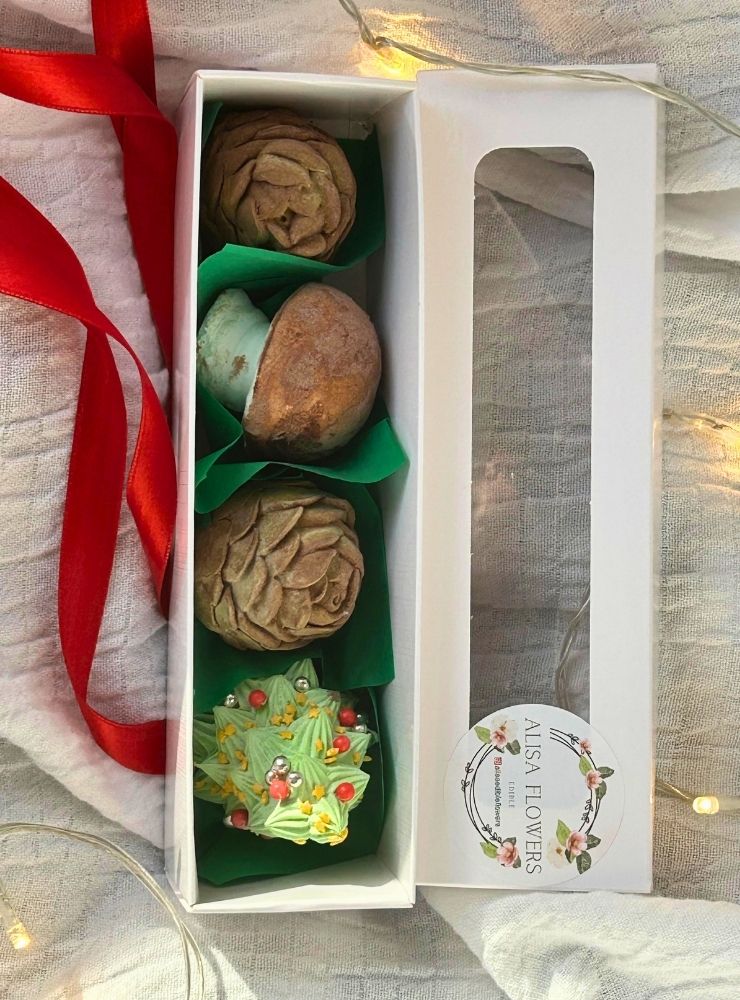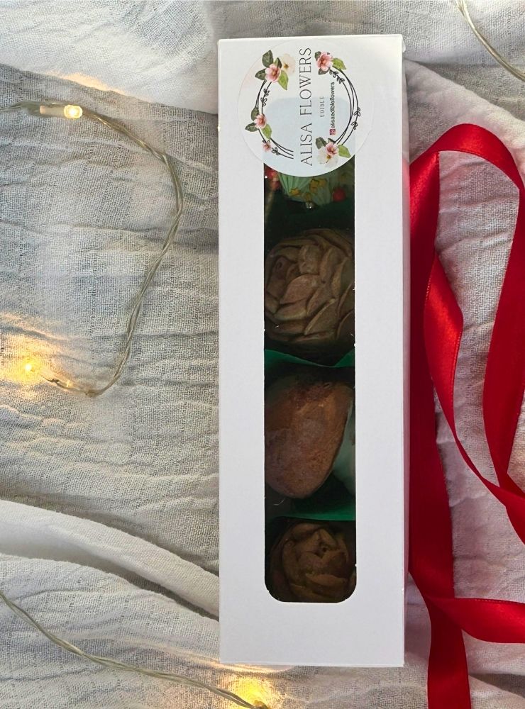 Fantezi Yılbaşı Box No.02 – 20×5 cm, 4 adet yenilebilir marshmallow laleden oluşan zarif bir mini hediye kutusudur.