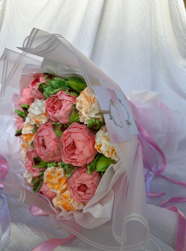 25 cm boyutunda, el yapımı yenilebilir marshmallow çiçeklerden oluşan fantezi bukettir.