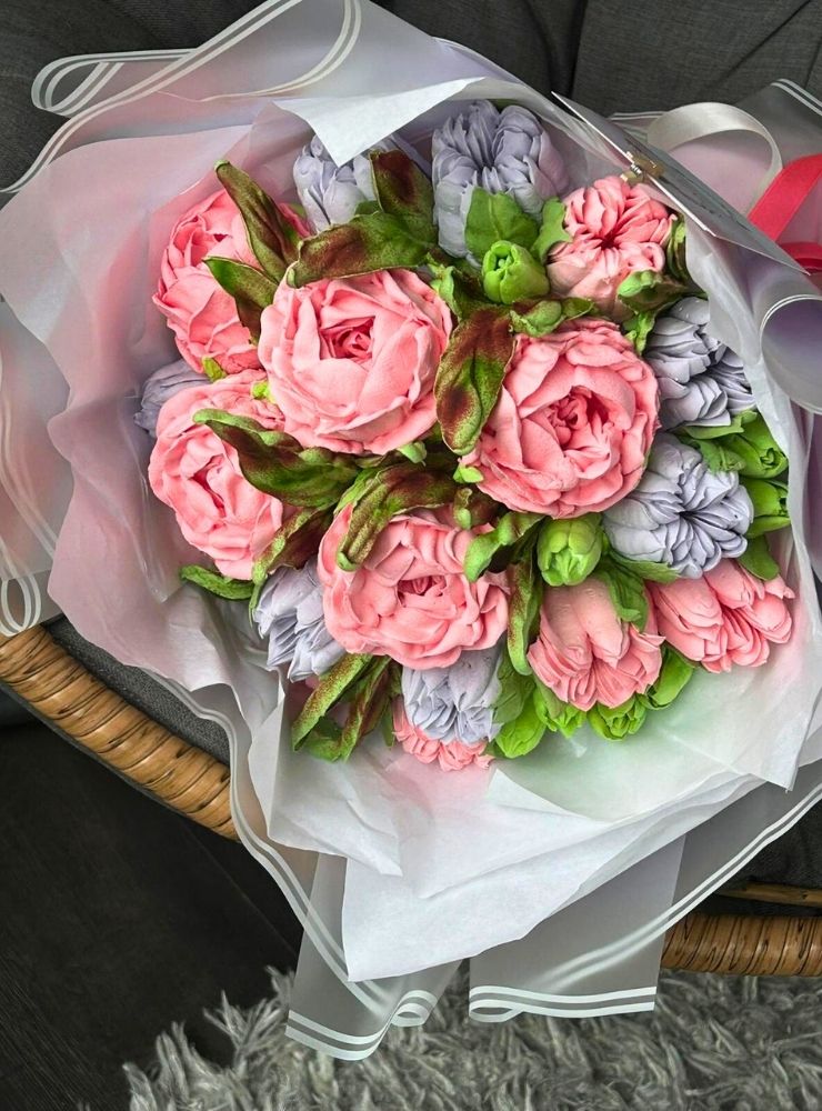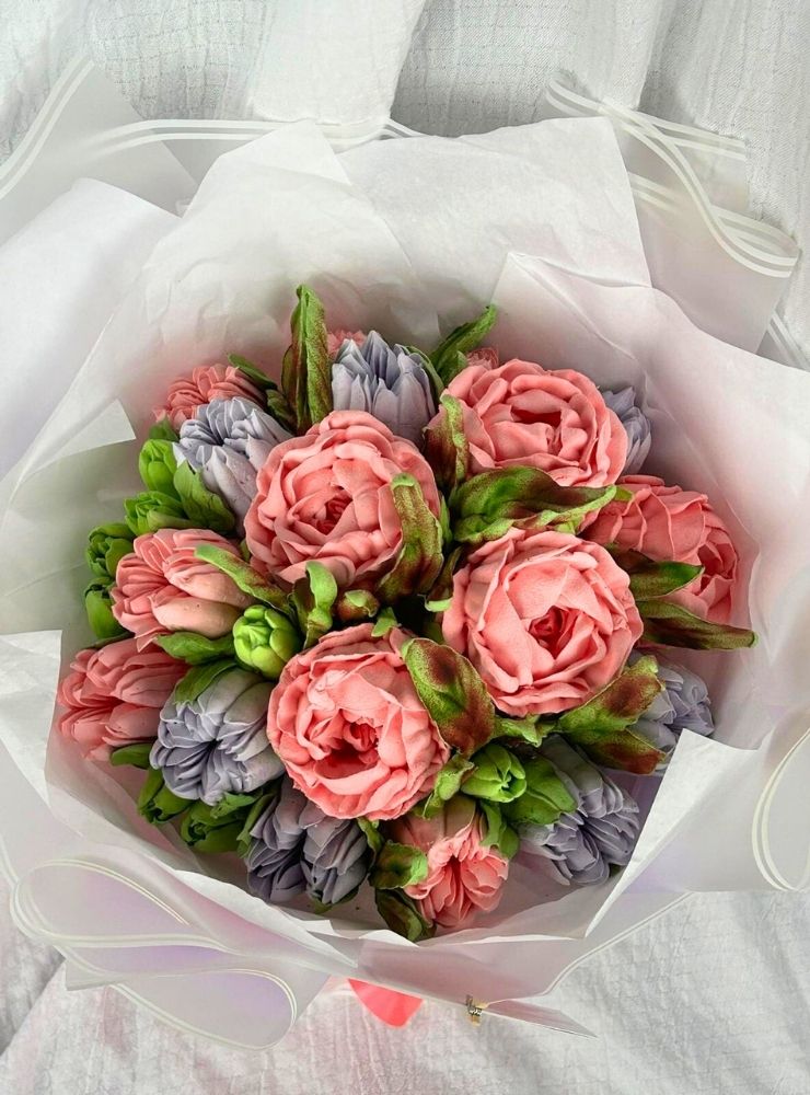 40 cm boyutunda, el yapımı yenilebilir marshmallow çiçeklerden oluşan büyük boy bir fantezi bukettir.