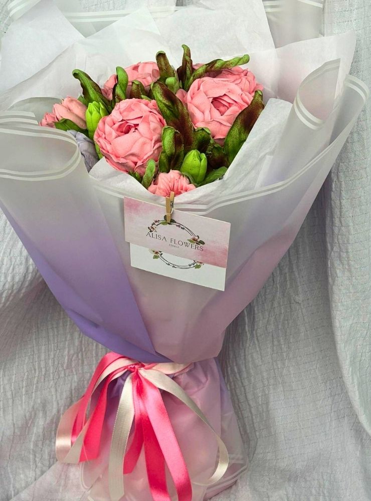 25 cm boyutunda, el yapımı yenilebilir lalelerden oluşan özel bir bukettir.