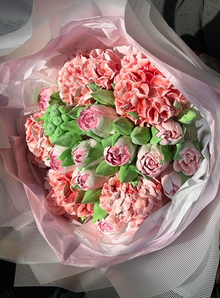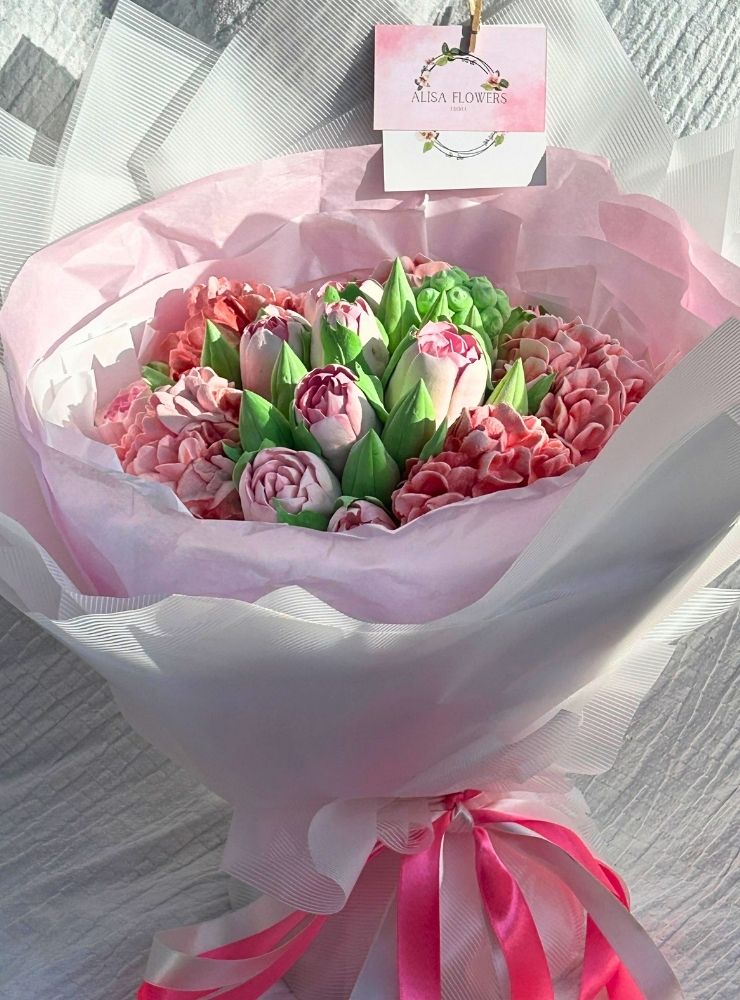 25 cm boyutunda, el yapımı yenilebilir marshmallow çiçeklerden oluşan fantezi bukettir.