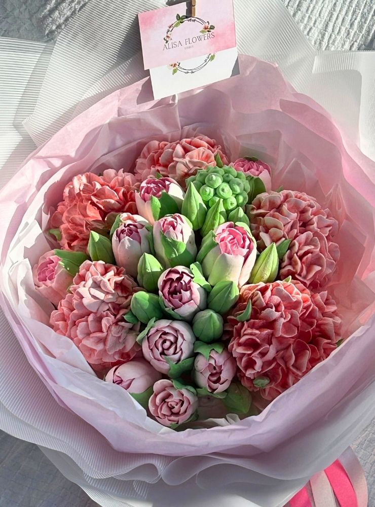• 25 cm boyutunda el yapımı yenilebilir fantezi buket