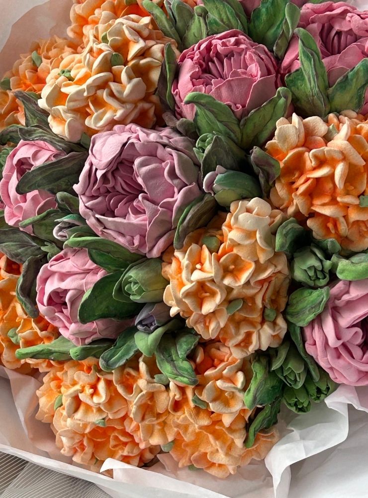 30 cm boyutunda, el yapımı yenilebilir marshmallow çiçeklerden oluşan fantezi bukettir.