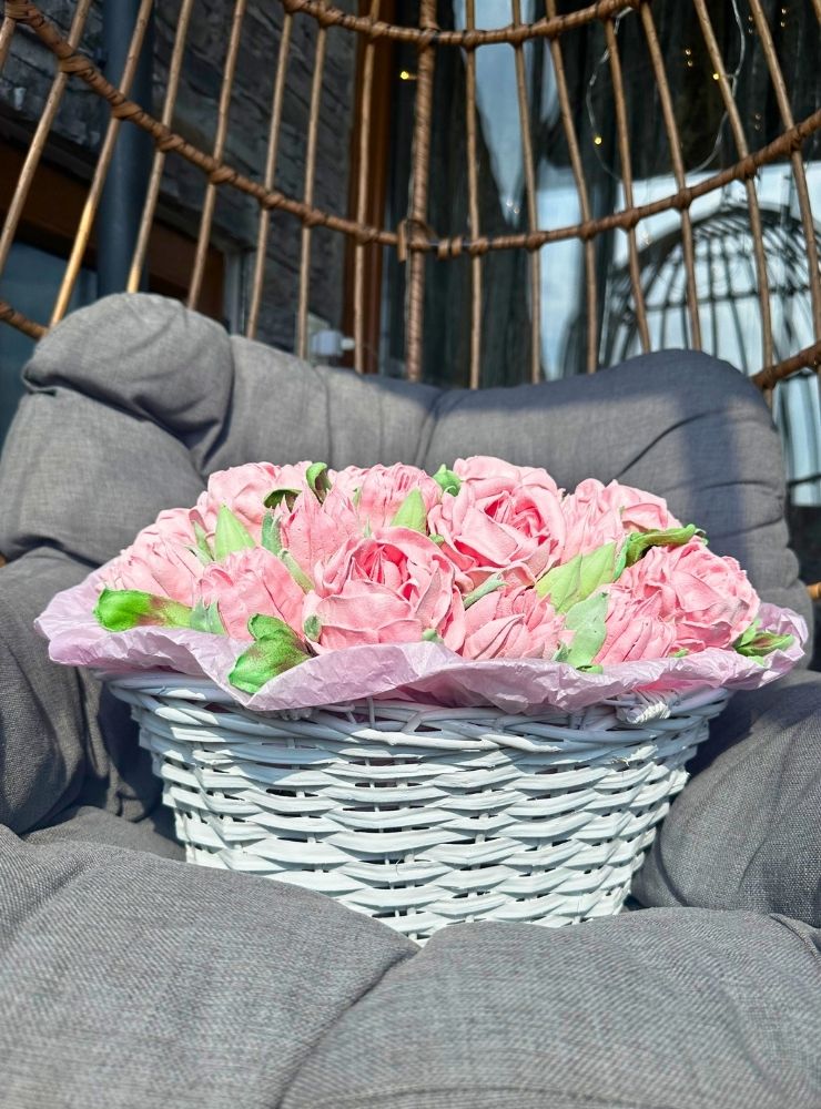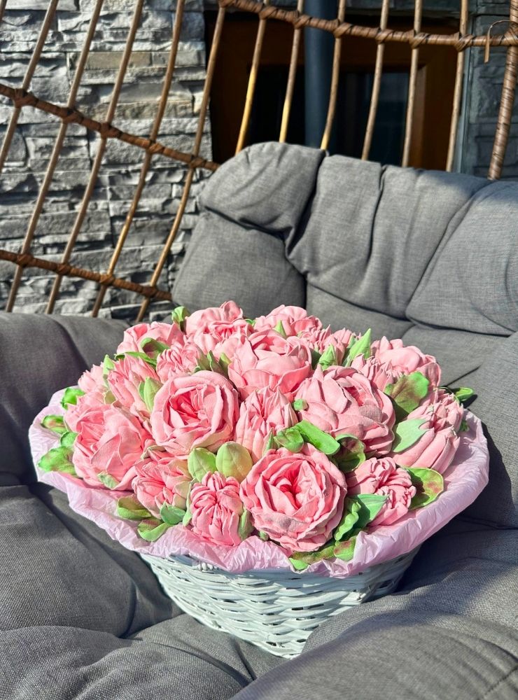 Sepetteki tüm çiçekler tamamen yenilebilir marshmallow malzemesinden üretilmiştir.