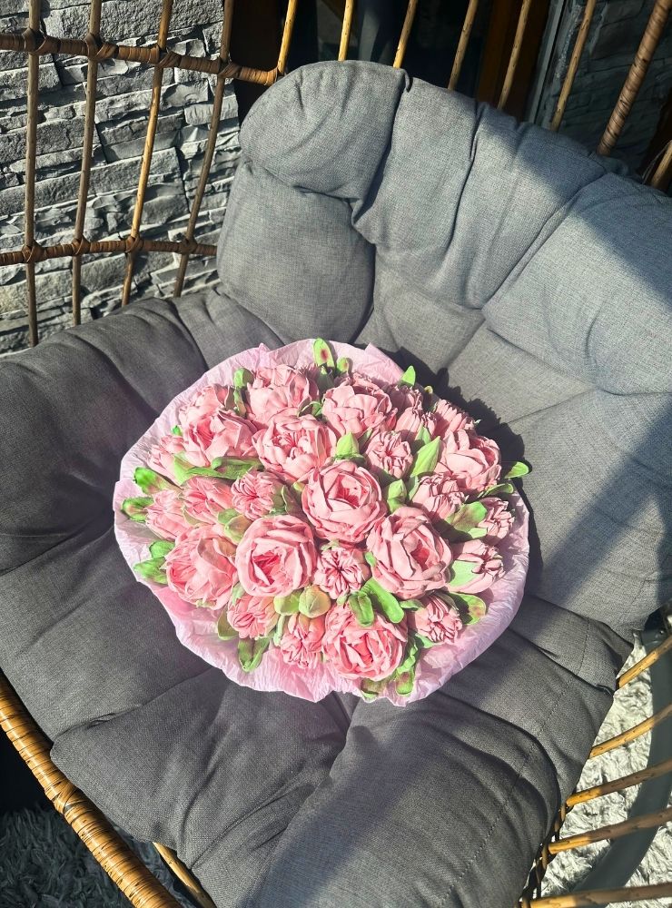 20 cm boyutunda, el yapımı yenilebilir marshmallow çiçeklerden oluşan fantezi bukettir.