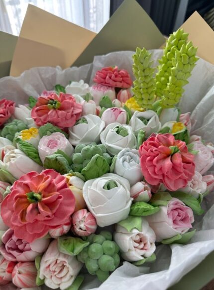 40 cm boyutunda, el yapımı yenilebilir marshmallow çiçeklerden oluşan büyük boy bir fantezi bukettir.