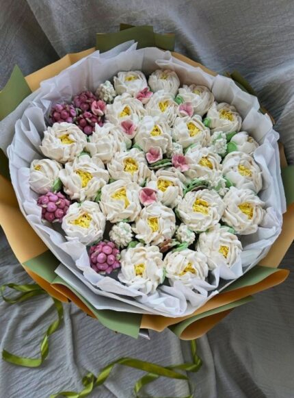 40 cm boyutunda, el yapımı yenilebilir marshmallow çiçeklerden oluşan fantezi bukettir.