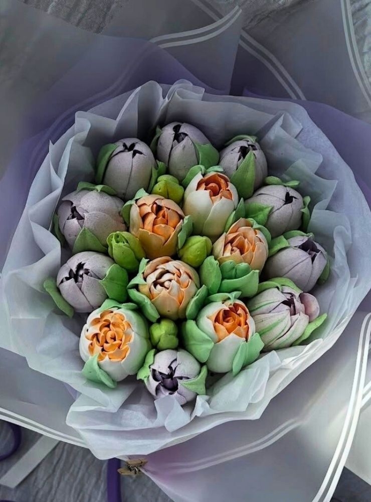 25 cm boyutunda, el yapımı yenilebilir lalelerden oluşan özel bir bukettir.