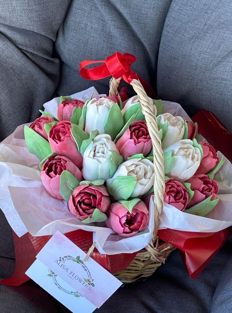 Sepetteki tüm çiçekler tamamen yenilebilir marshmallow malzemesinden üretilmiştir.