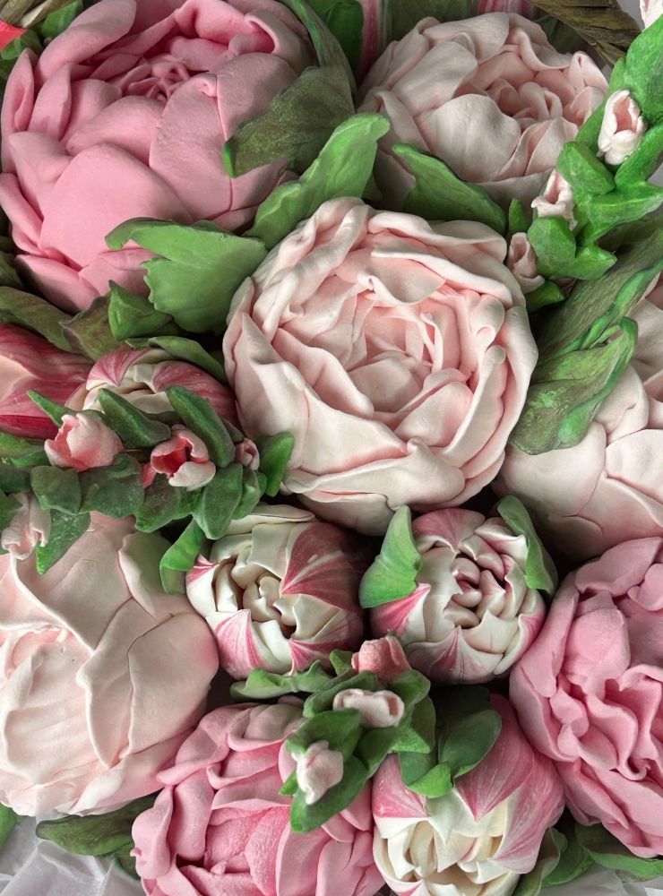 Sepetteki tüm çiçekler tamamen yenilebilir marshmallow malzemesinden üretilmiştir.