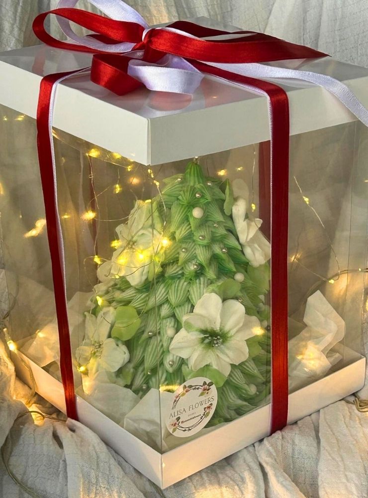 Yılbaşı konseptine özel olarak hazırlanan bu marshmallow ağaç, 20×25 cm ölçülerinde tamamen yenilebilir malzemelerle tasarlanmıştır. Görsel olarak dikkat çekici, şık ve yılbaşı ruhunu yansıtan bir hediye alternatifi sunar. Özel günlerde, kutlamalarda ve dekoratif sunumlarda rahatlıkla kullanılabilir.